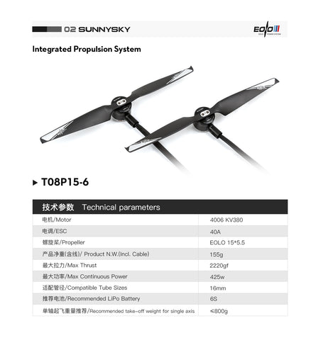 Choosing a SunnySky integrated motor, ESC, and propeller combination for your power system is a straightforward process. The digits following 'T' denote the suggested thrust in kilograms, while those following 'P' indicate the propeller's diameter and pitch. For instance, a setup labeled as T08P15-4 signifies that the system can consistently produce a thrust of 0.8 kilograms by utilizing a 15-inch propeller with a 4-inch pitch. Additionally, the motor includes built-in LED lights and an arm-mounting feature. These attributes streamline the motor selection process and simplify its installation and setup.