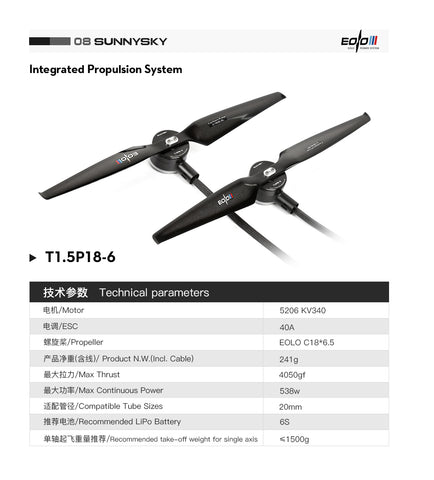 Choosing a SunnySky integrated motor, ESC, and propeller combination for your power system is a straightforward process. The digits following 'T' denote the suggested thrust in kilograms, while those following 'P' indicate the propeller's diameter and pitch. For instance, a setup labeled as T08P15-4 signifies that the system can consistently produce a thrust of 0.8 kilograms by utilizing a 15-inch propeller with a 4-inch pitch. Additionally, the motor includes built-in LED lights and an arm-mounting feature. These attributes streamline the motor selection process and simplify its installation and setup.