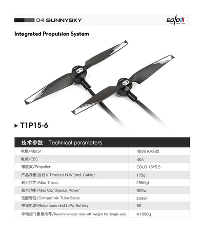 Choosing a SunnySky integrated motor, ESC, and propeller combination for your power system is a straightforward process. The digits following 'T' denote the suggested thrust in kilograms, while those following 'P' indicate the propeller's diameter and pitch. For instance, a setup labeled as T08P15-4 signifies that the system can consistently produce a thrust of 0.8 kilograms by utilizing a 15-inch propeller with a 4-inch pitch. Additionally, the motor includes built-in LED lights and an arm-mounting feature. These attributes streamline the motor selection process and simplify its installation and setup.